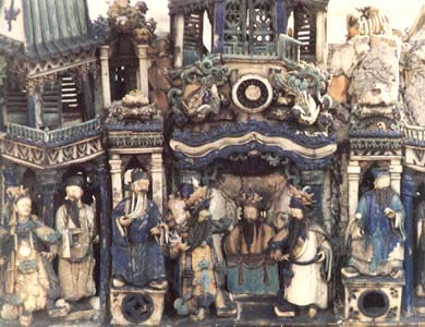在陈家祠内主要建筑物的正脊、垂脊上都装饰有这种形制复杂、风格华丽的陶塑和灰塑。