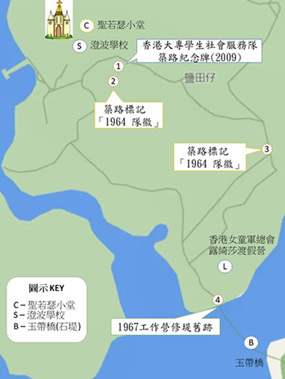 - 石堤兩旁仍可見石堤由村民與服務隊兩次修建的痕跡